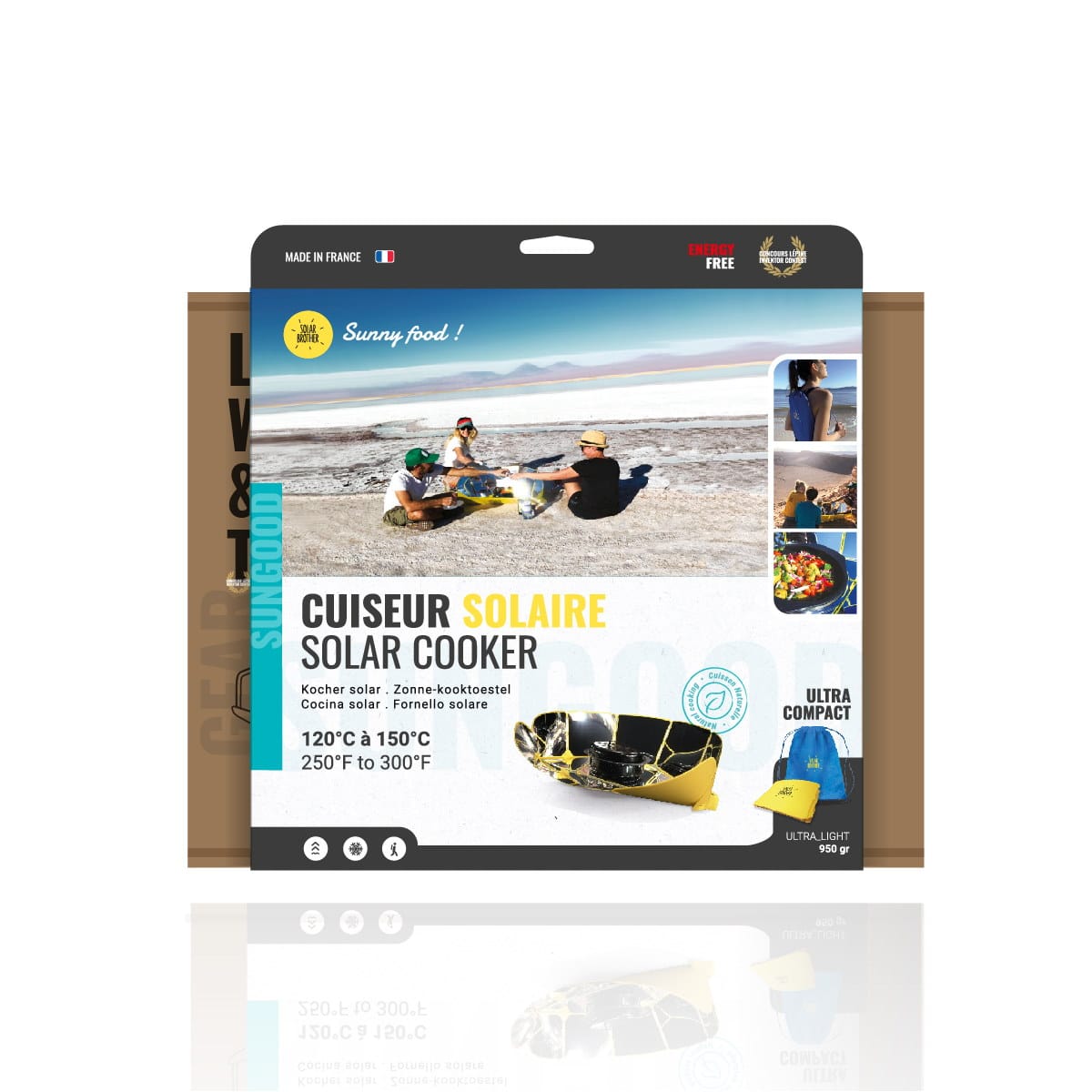 La cocina solar SUNGOOD viene con reflectores a pegar antes del primer uso, una bolsa de transporte, dos bolsas de cocción, una rejilla reposa-plato y un libreto de recetas solares.