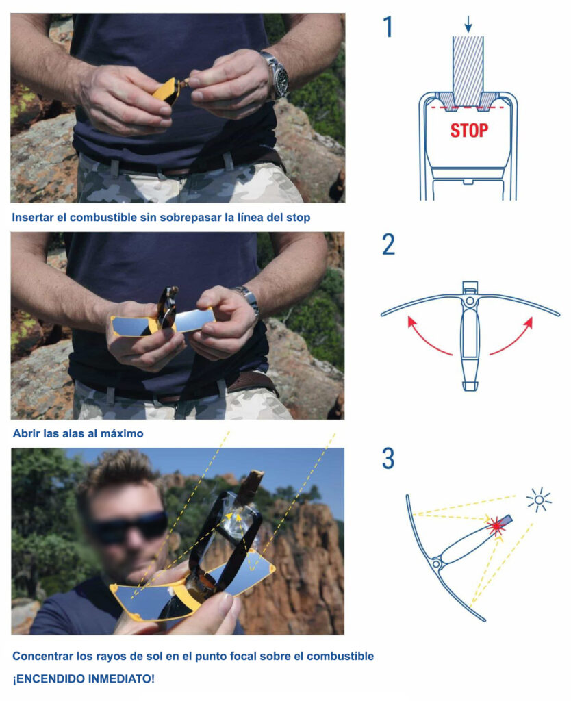 El Suncase Gear utiliza la tecnología del sol concentrado que permite alcanzar altas temperaturas casi instantáneamente por concentración de los rayos de sol en un punto focal. Un concentrador solar de bolsillo de verdad, concebido con espejos parabólicos de alta reflectancia. Con una temperatura que puede alcanzar los 400°C en el punto focal, enciende inmediatamente por incandescencia todo tipo de combustible.