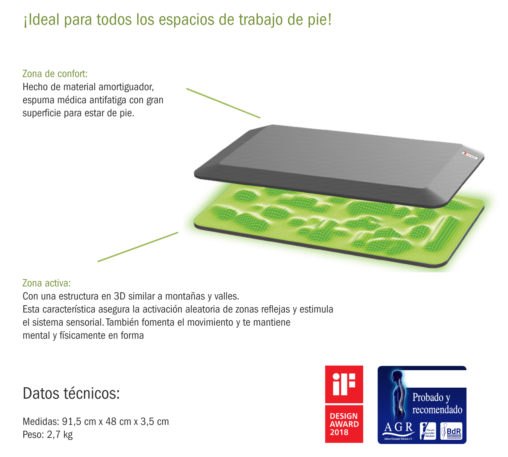 La alfombra suave, resistente y proactiva alivia el estrés de todo el cuerpo, protege las articulaciones y ayuda a prevenir el cansancio de las piernas. Se puede usar descalzos o con zapatos planos, en tu casa, en la oficina o cualquier puesto de trabajo donde se trabaja de pie.