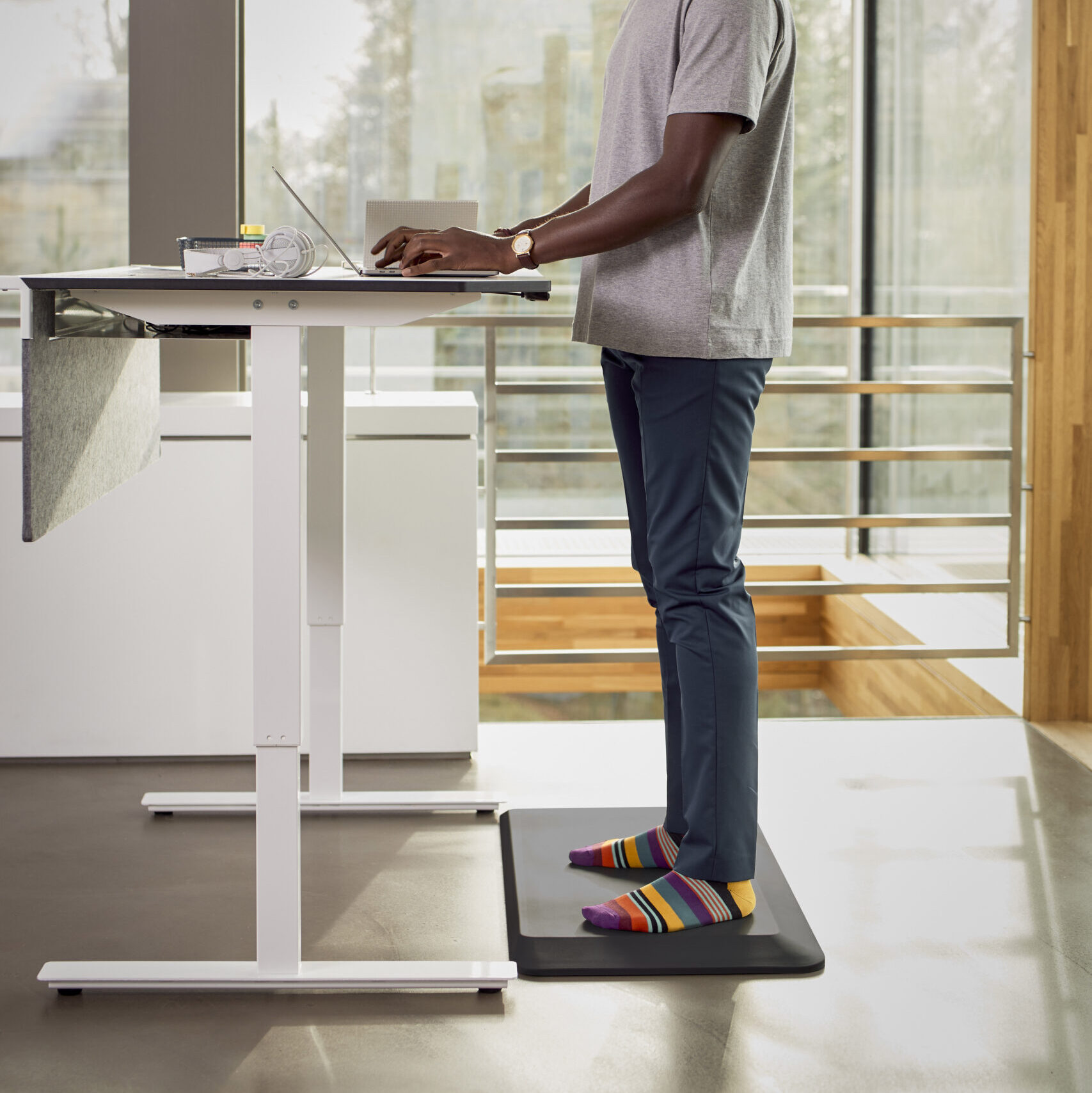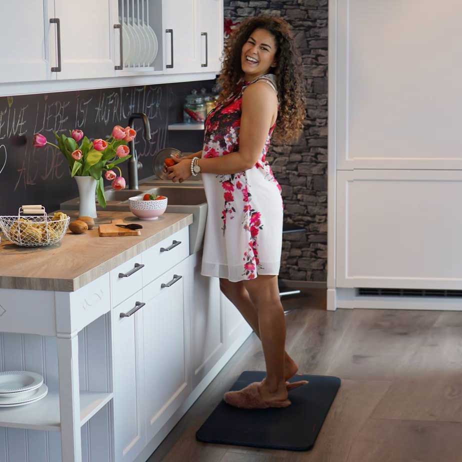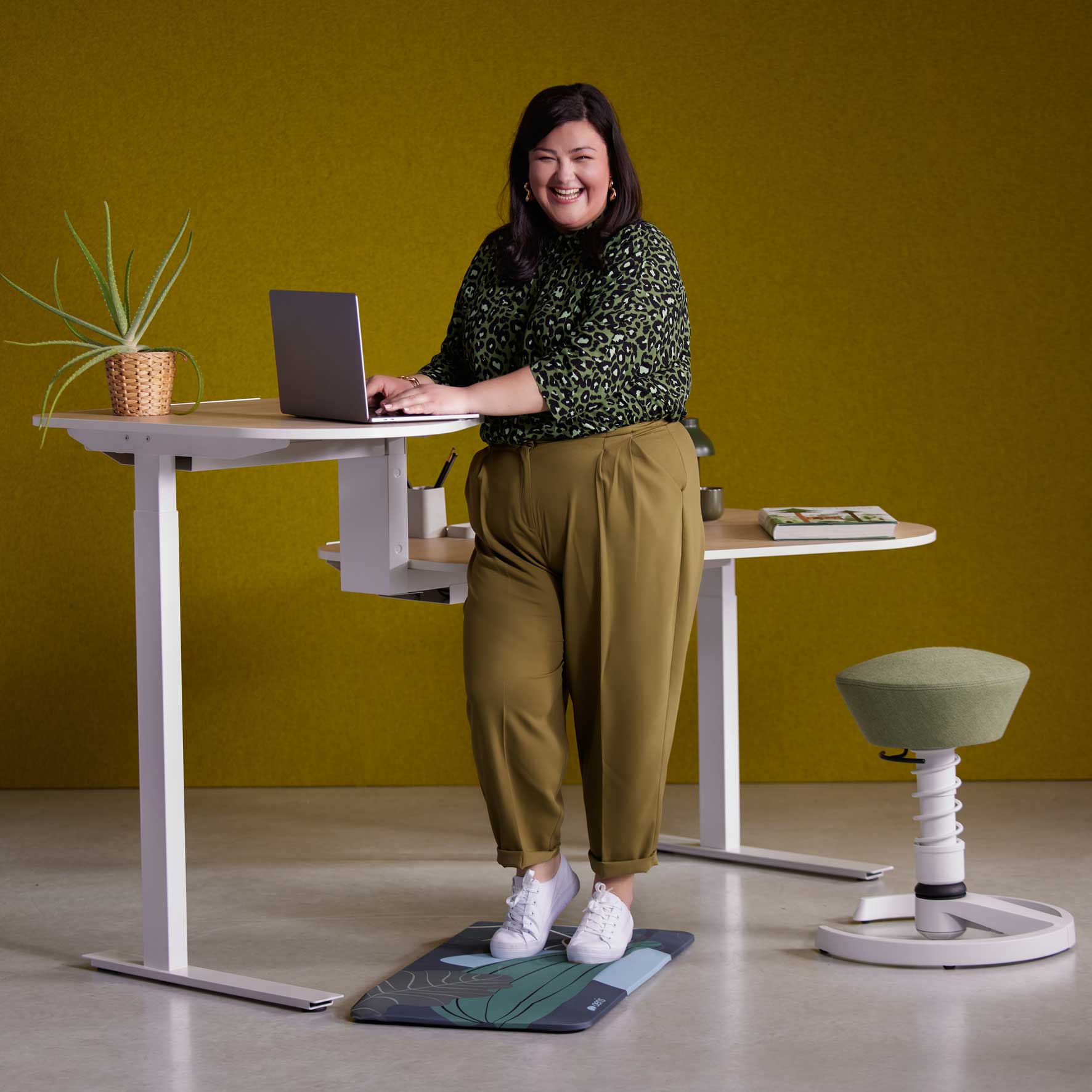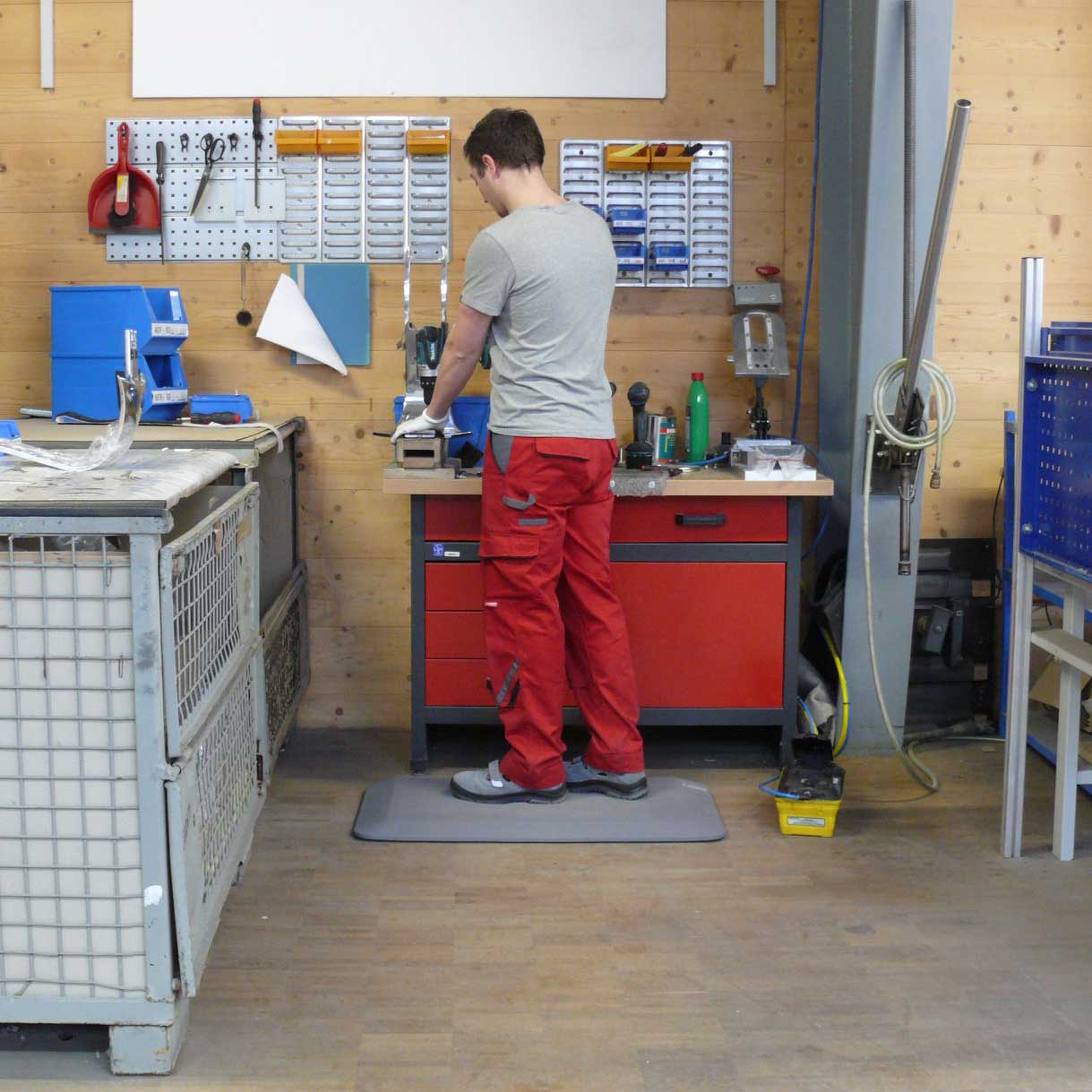 ¡Mejor estar de pie natural y activamente! Estar quietos en un suelo duro es un esfuerzo extenuante. Las alfombras planas de espuma convencionales aportan poco alivio. Con la alfombra activa Aeris Muvmat se está de pie naturalmente, activo y relajado y siempre en movimiento, como pararse en el suelo del bosque.