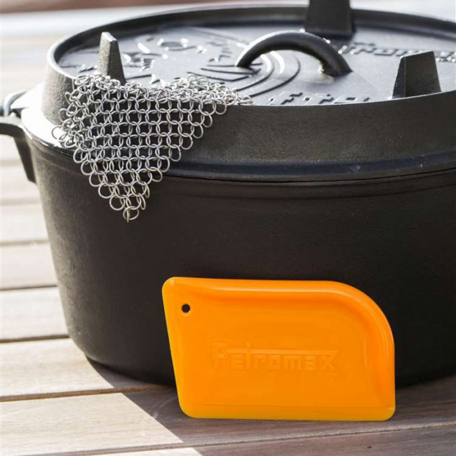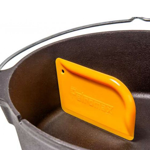 Deje enfriar la sartén o cacerola, dejarlos en remoje con agua caliente, luego retire los restos quemados con el rascador. Por supuesto, no usar liquido lavavajillas para limpiarlos. Después de limpiar, enjuague bien nuevamente. Antes de volver a guardar tu recipiente de hierro fundido en el armario, sécalo bien y engrasa como de costumbre.