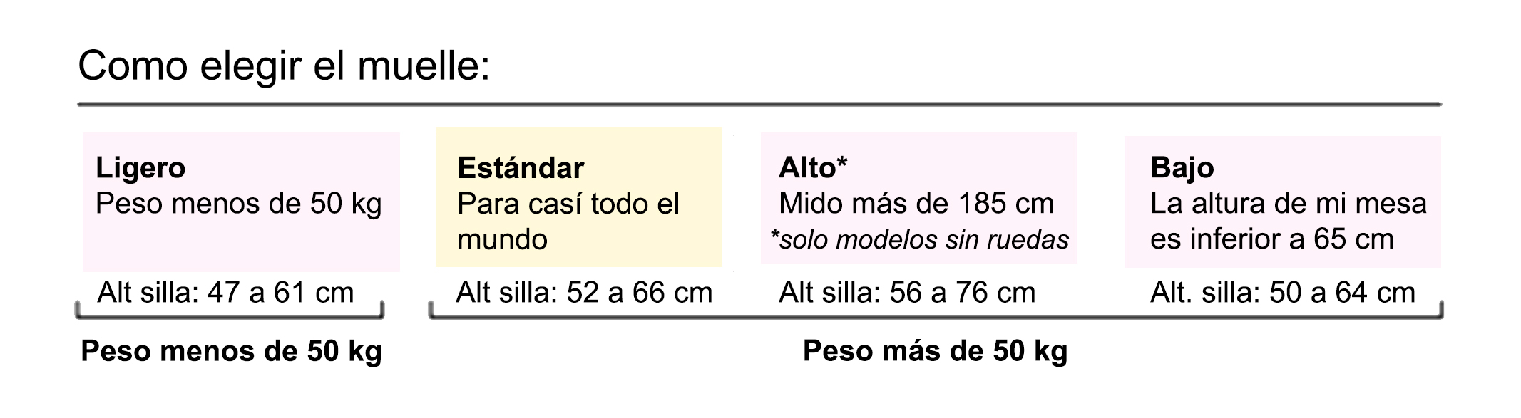 • Altura silla sin carga: según la opción del muelle elegido (ver cuadro «como elegir el muelle»)